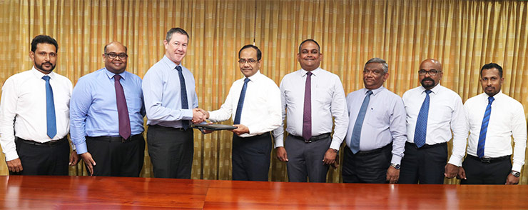 Commercial Bank’s Chief Operating Officer Mr S. Prabagar (4th from left) and AMW’s Group Managing Director Mr Peter Mackenzie exchange the agreement in the presence of representatives of the management of the two institutions.