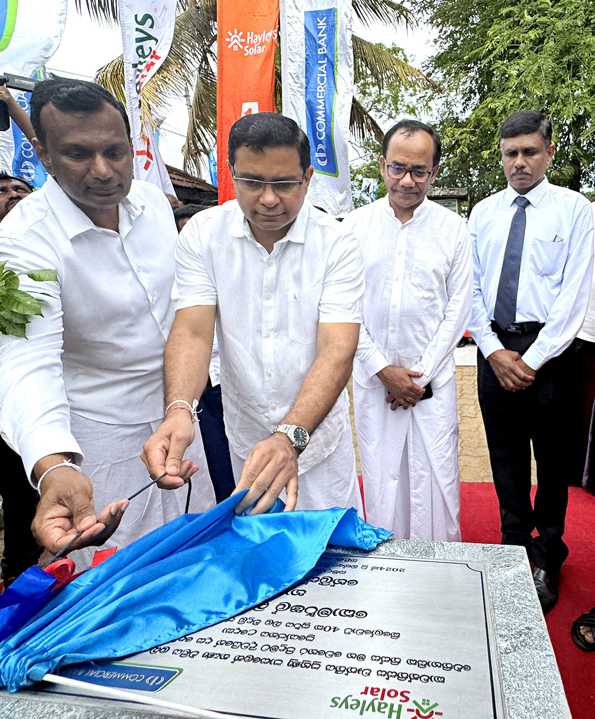 Pictured here at the donation of the solar power system are Commercial Bank Managing Director/CEO Mr Sanath Manatunge, the Bank’s Chief Operating Officer Mr S. Prabagar, Hayley's Solar Managing Director/ CEO Mr Hasith Premathilake and the Director General of the Tertiary and Vocational Education Commission Dr K. A. Lalithadheera unveiling the commemorative plaque.