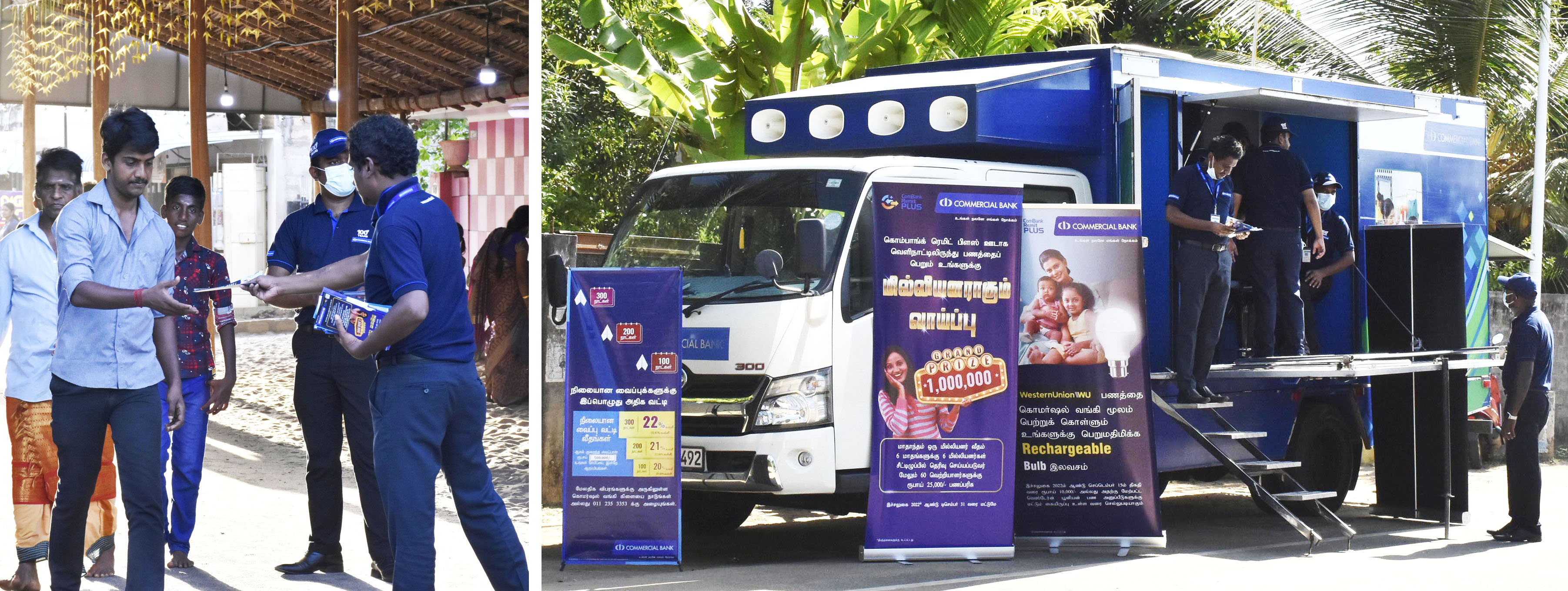 Pictured here are members of the Bank’s staff interacting with customers during the promotion and a ComBank Bank-on-Wheels unit deployed in Nallur.