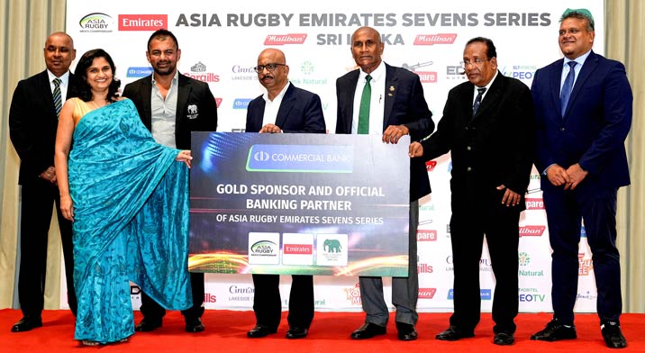 Ms Ashani Senaratne, Assistant General Manager - Marketing at Commercial Bank's symbolically presents the Bank's sponsorship to Sri Lanka Rugby in the presence of (from left) Mr Asanga Seneviratne, Asia Rugby Tournament Chairman; Mr Pavithra Fernando, President - Sri Lanka Rugby; Hon. Sunil Kumara Gamage, Minister of Sports; Mr Nalin De Silva, Tournament Committee Chairman; Mr Hassan Sinhawansa, Tournament Director; and Mr Shanitha Fernando, Deputy President - Sri Lanka Rugby.