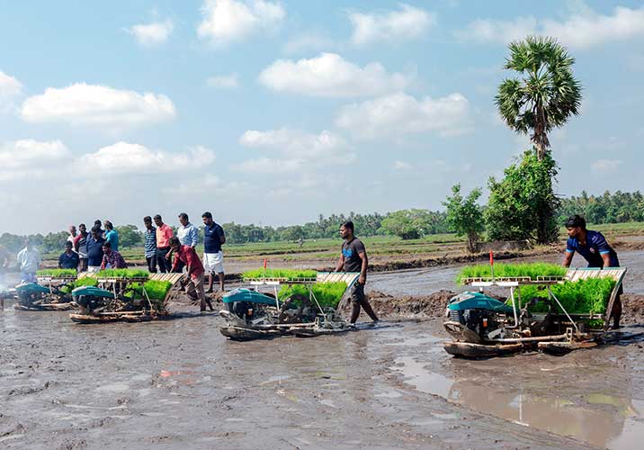 Mahilankadu farmers experience mechanised transplantation of paddy seedlings at the Commercial Bank programme.