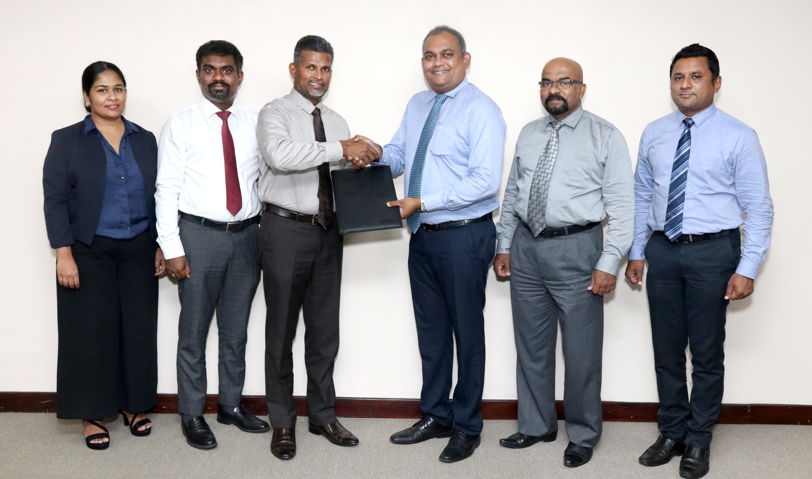 Commercial Bank Deputy General Manager – Retail Banking and Marketing Mr Hasrath Munasinghe exchanges the agreement with the Chief Operating Officer of Capitol Towers Mr Dhammike Wasanthakumara in the presence of Capitol Towers Limited Manager – Sales Ms. Thakshila Ariyawansa, Senior Manager – Sales Mr. C Thuwaregan, Commercial Bank’s Chief Manager – Retail Products Department Mr Dushmantha Jayasuriya and Product Manager – Home Loans Mr Hasela De Silva.