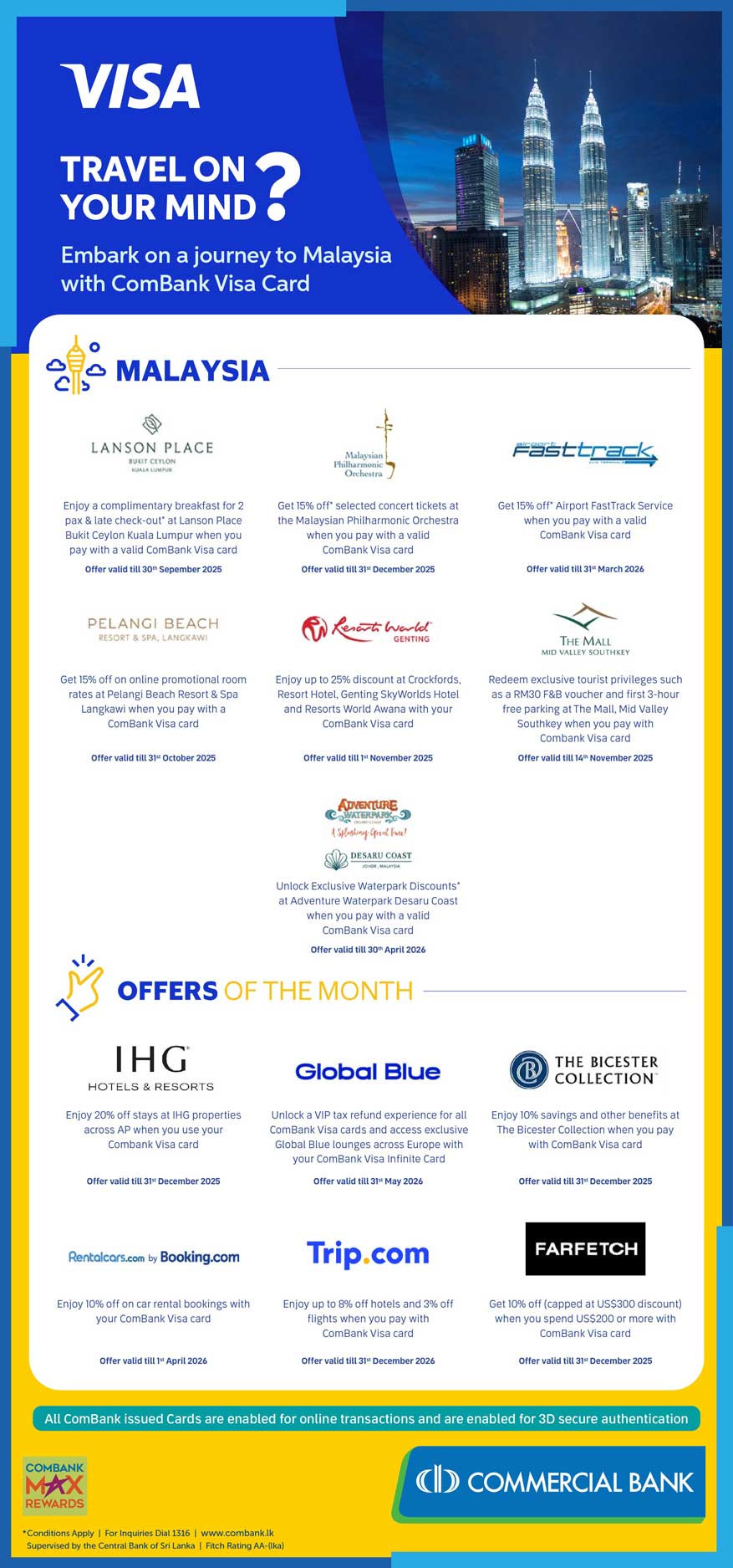 - The promotion is open for all Visa Credit and Debit Cards issued by Commercial Bank of Ceylon PLC.
